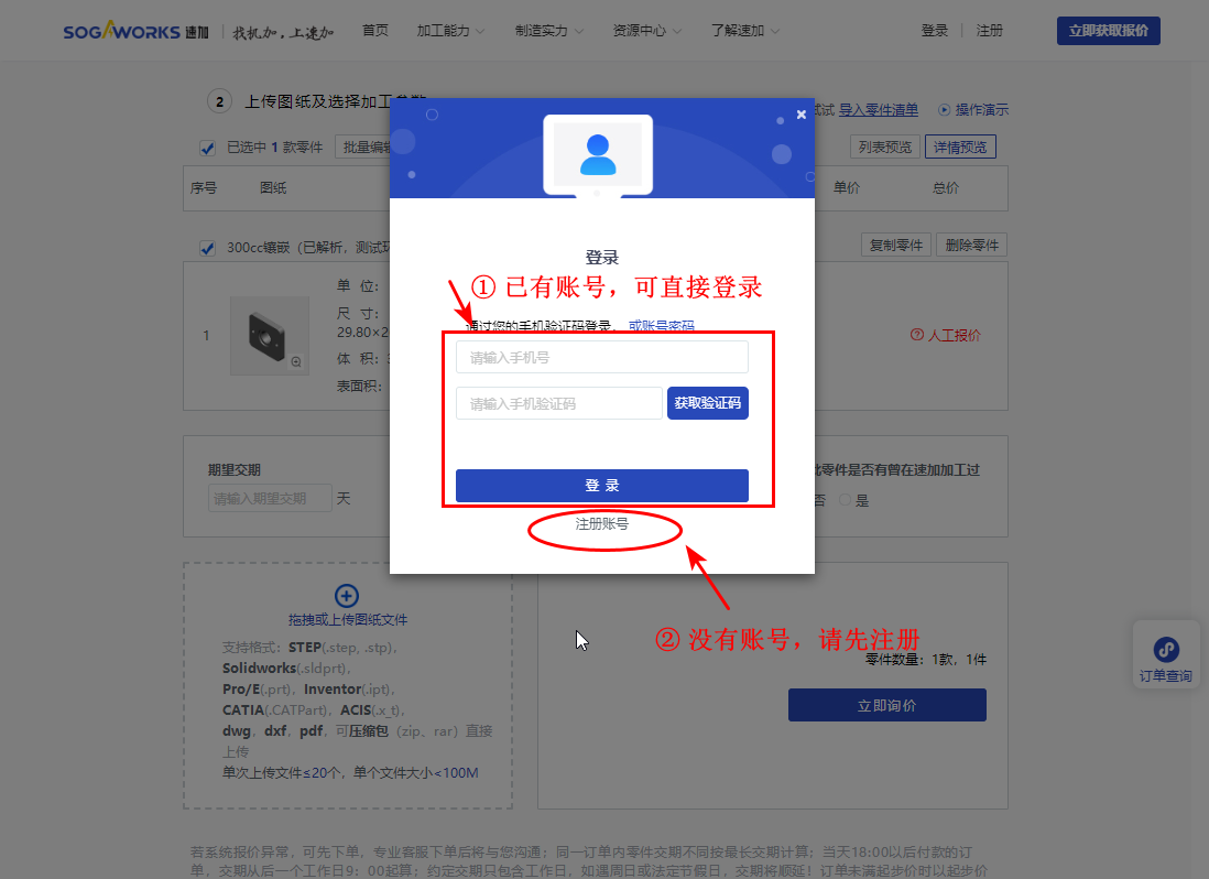 6. 如未注冊/登錄,按提示注冊/登錄,則可提交詢價